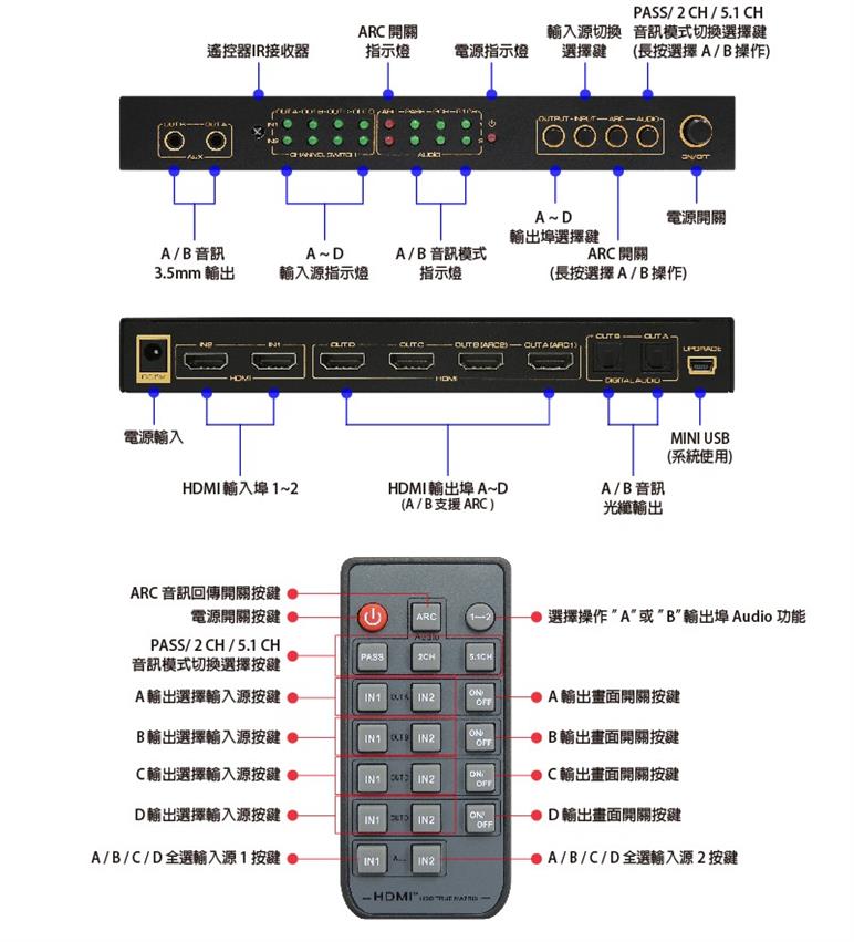 - 連接兩路 HDMI 影音輸入源與四路輸出埠 ("A"、"B"、"C"、"D" 輸出埠),並擷取 "A" 和 "B" 輸出埠的 HDMI 數位音訊。