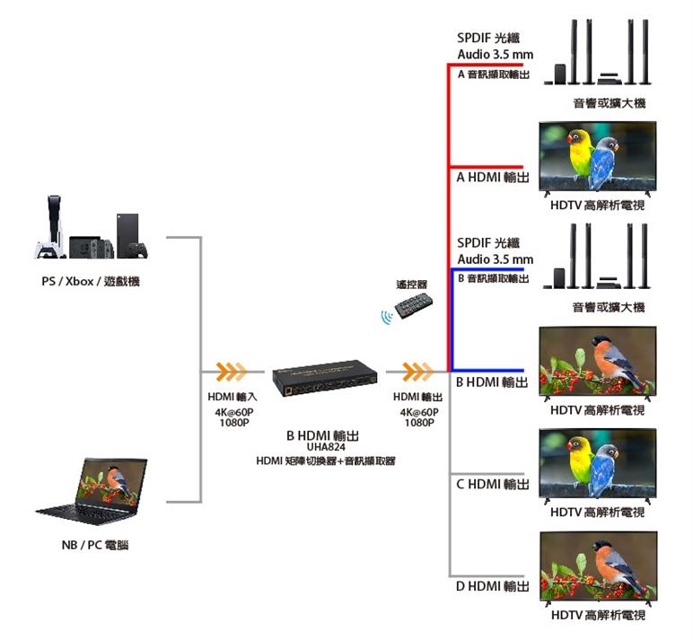 UHA824 同時可將輸入的 HDMI 訊號分離出 SPDIF 光纖數位音訊與 Audio 3.5 mm 立體聲,方便連接音響或擴大機。提供 A / B 輸出埠個別獨立(共 2 組)的影像輸出與音訊擷取功能(Dual Audio)。支援 EDID、ARC(音訊回傳),使用者可用紅外線遙控器或面板按鈕輕鬆切換分配 HDMI 訊號與顯示。