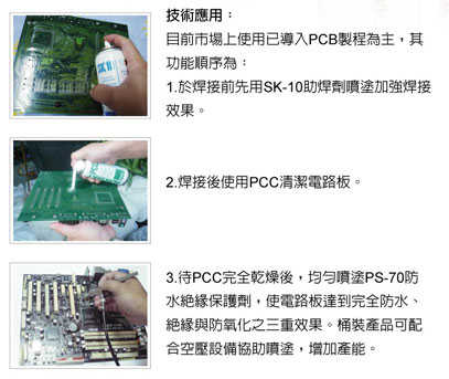 印刷電路板焊接後,其殘留物不僅看起來不美觀,亦會產生腐蝕性傷害及因漏電而導致斷電,而且即使是小小焊接微物,一旦與熔劑結合,亦會造成短路。PCC可清除電路板上殘留RA、RMA松香油污,因具絕緣性,可防止漏電。
