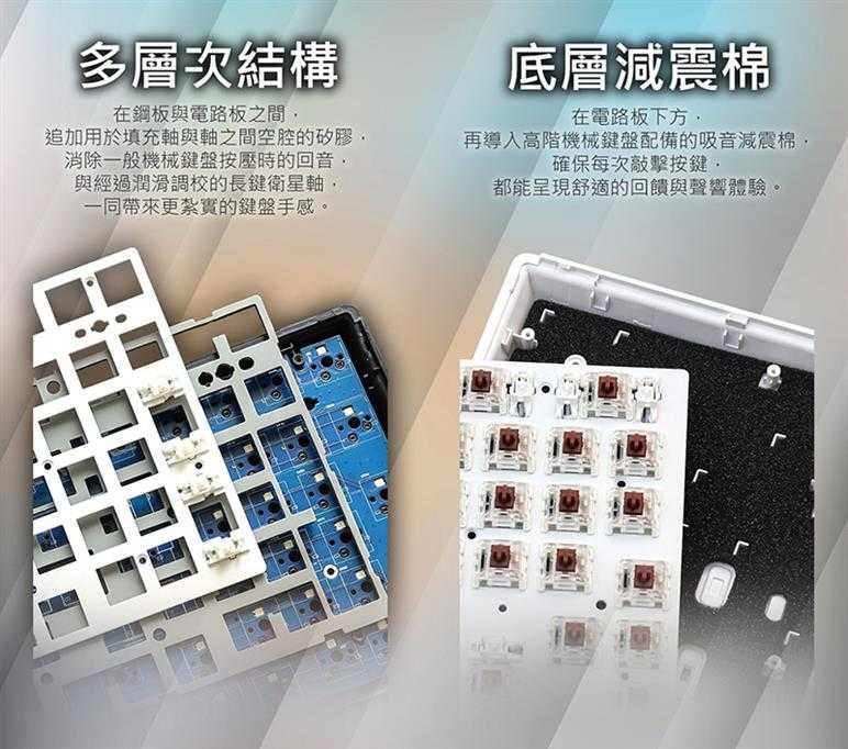 ●底蓋棉墊與矽膠夾心墊減少雜音,增強打感