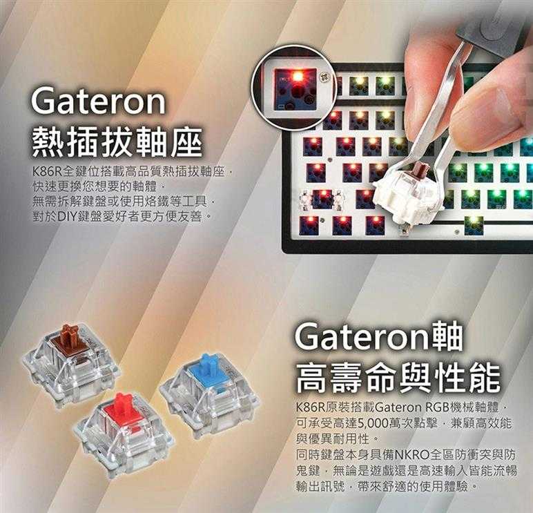 ●全鍵區採用Gateron熱插拔軸座,可自行替換鍵軸