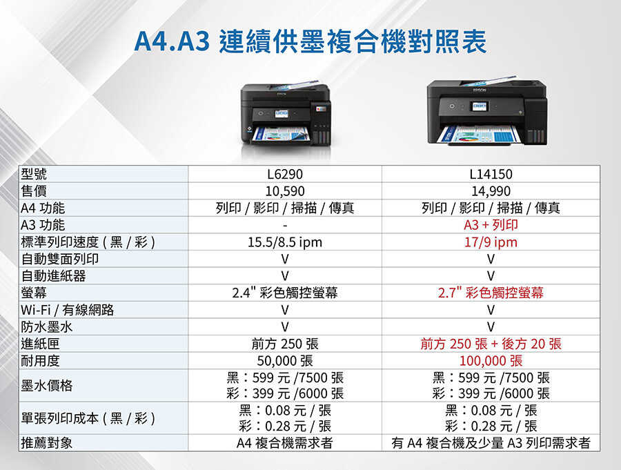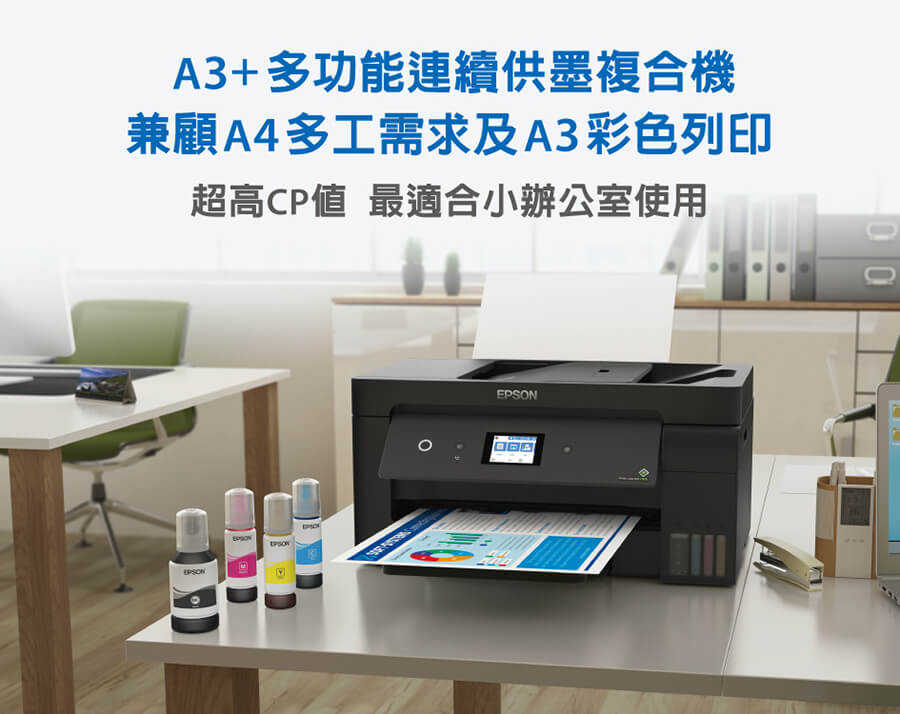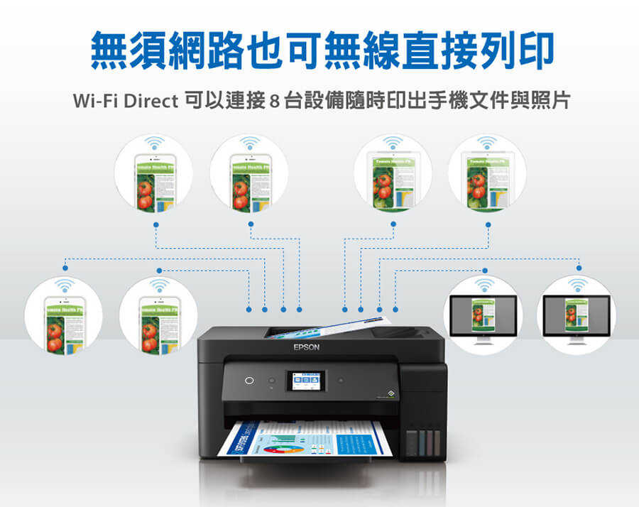 .特色優勢:A4自動雙面列印/A3滿版列印/防呆導墨墨瓶/行動列印透過LINE列印/ Wi-Fi Direct支援最多8台裝置連線/搭載壓電式耐久型噴頭