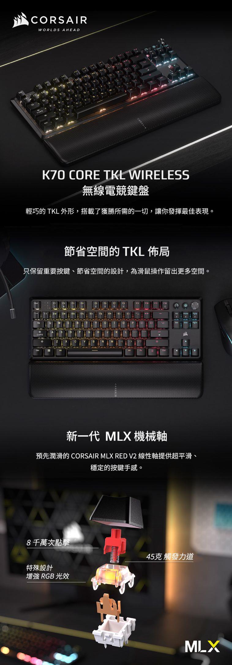CORSAIR 海盜船 K70 CORE TKL 無線電競鍵盤 紅軸 黑 英文 {{specImage.SkuName}}