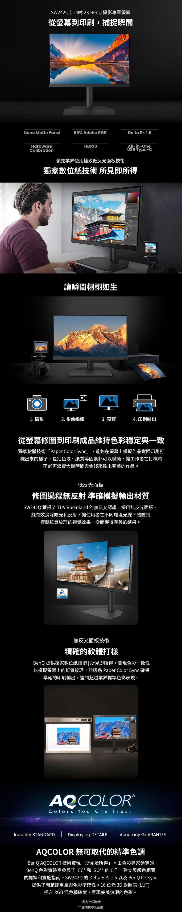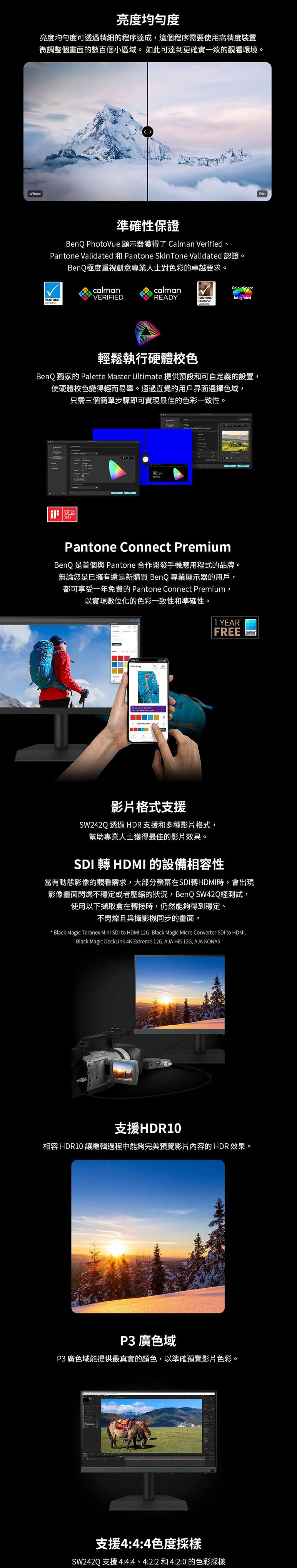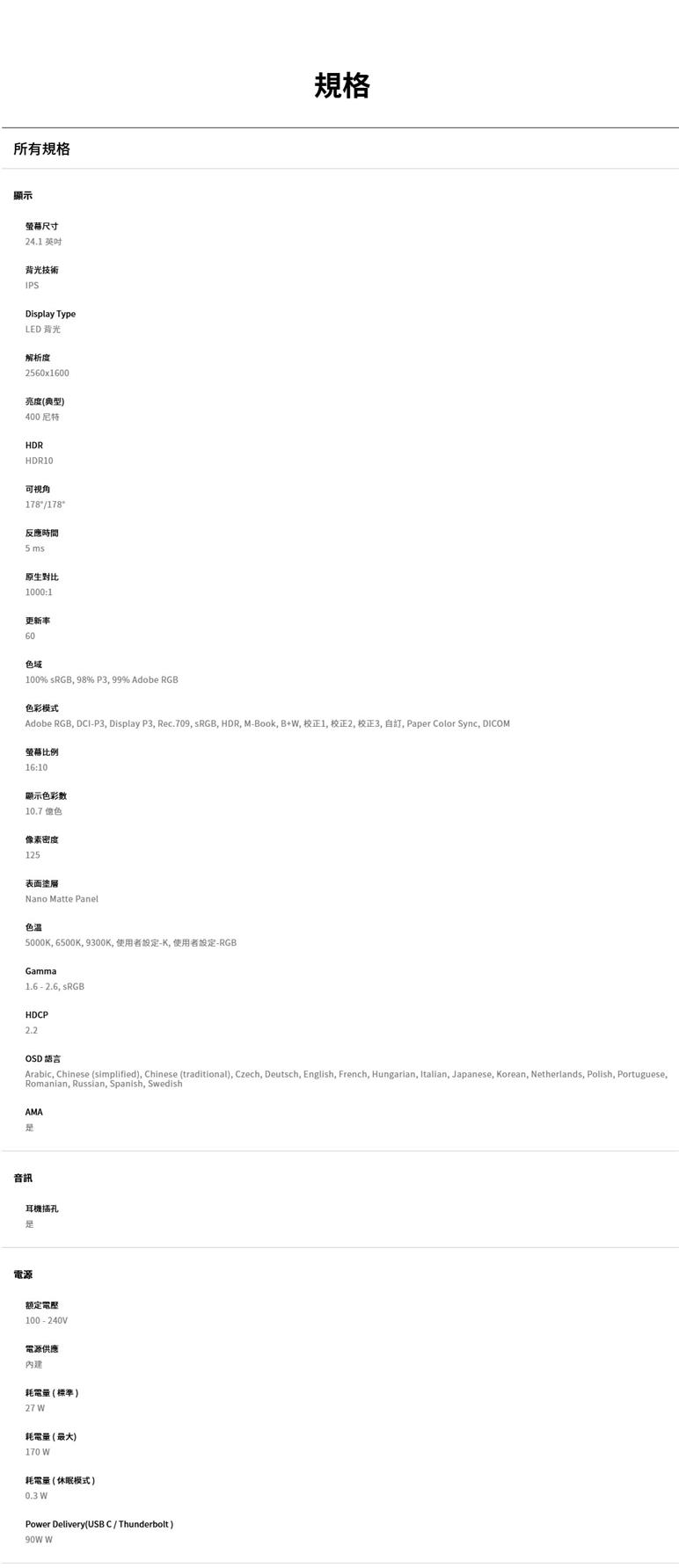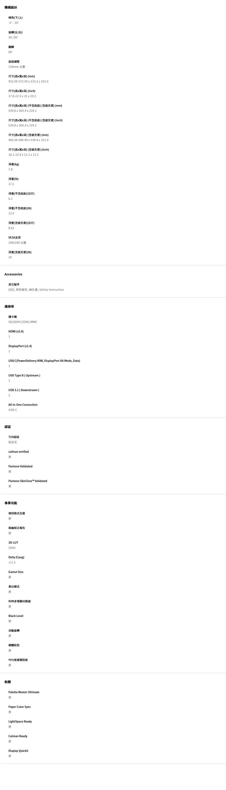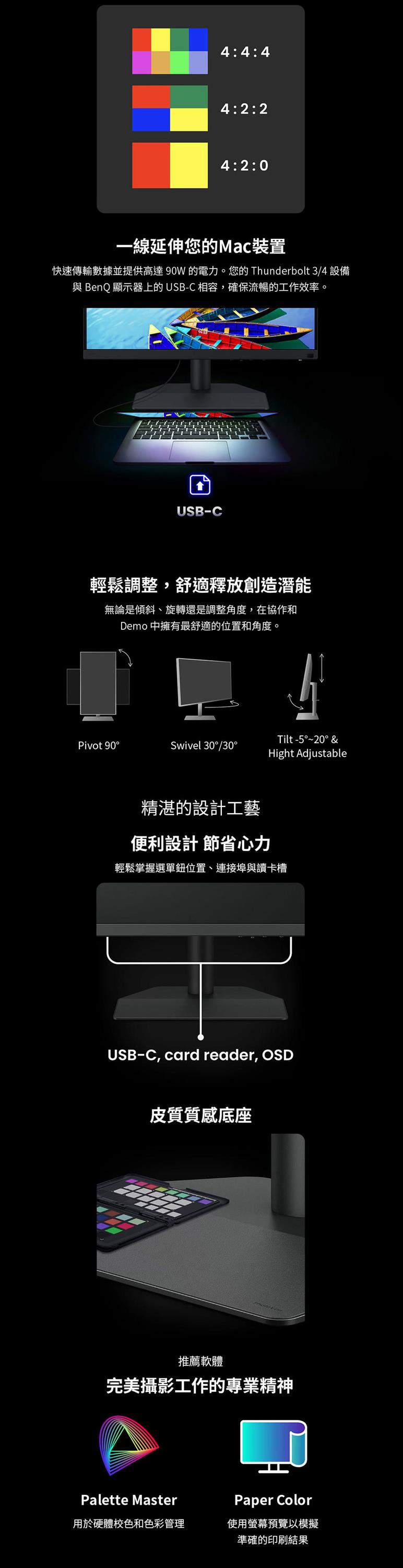 - 支援硬體校色 / HDR 10 / 獨家黑白模式 / USB-C PD90W / 軟打樣軟體 / 24P播放格式