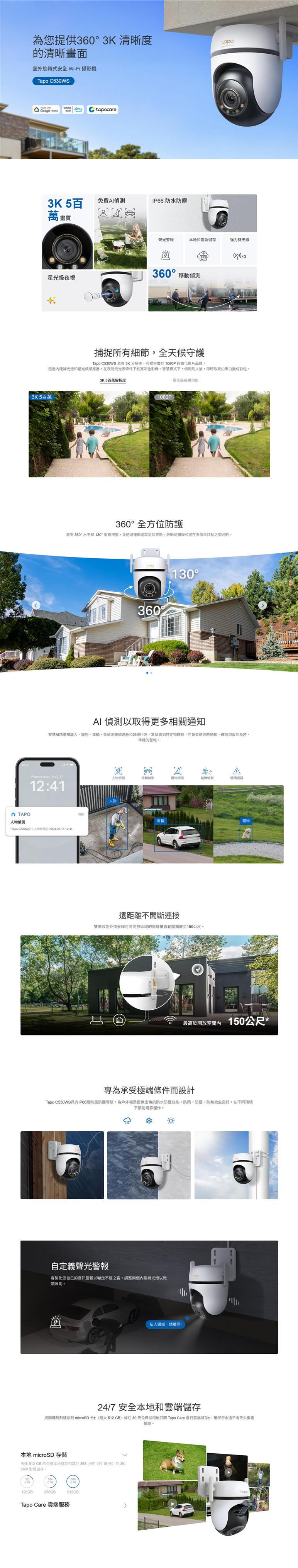 • 3K 500萬即時影像-Tapo C530WS 採用 2880 × 1620 分辨率,提供增強的影片品質以查看更多細節。