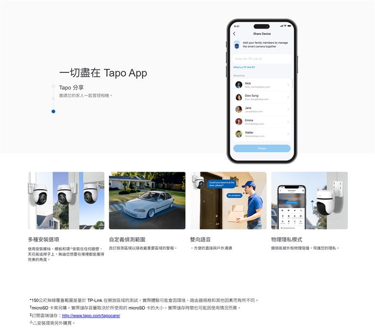 • 安裝的本地與雲端儲存-將關鍵時刻儲存到 microSD 卡†(最大 512 GB)或在 30 天免費試用後訂閱 Tapo Care 雲端儲存‡,確保您永遠不會失去重要影像。