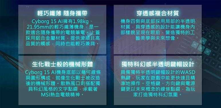 型 號:Cyborg 15 AI A1VEK-015TW-TBU7155H16GXXDX11MA