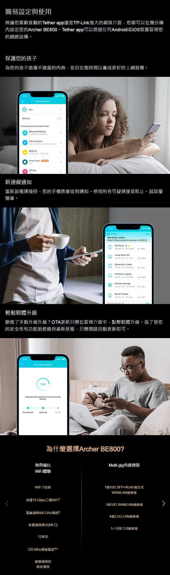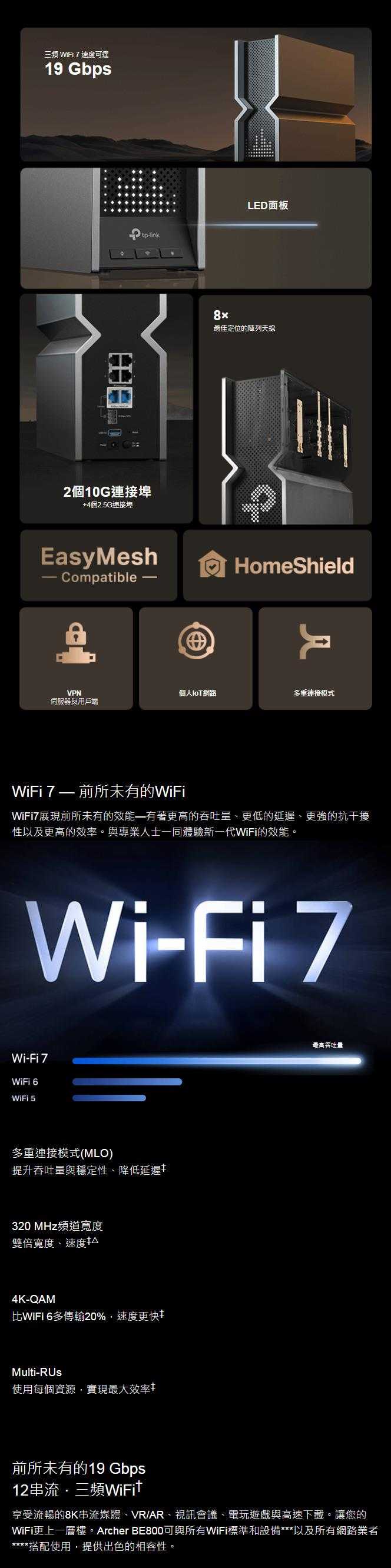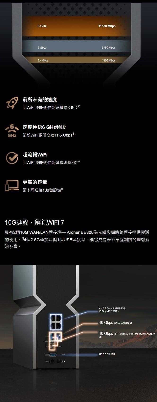 • 閃電般19 Gbps三頻WiFi 7:讓您的設備能夠高速運作,享受流暢的4K/8K串流媒體、身歷其境的AR/VR遊戲以及令人難以置信的高速下載†‡