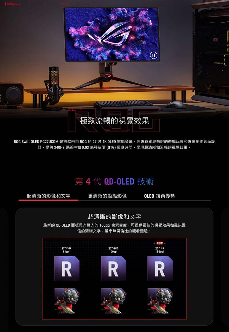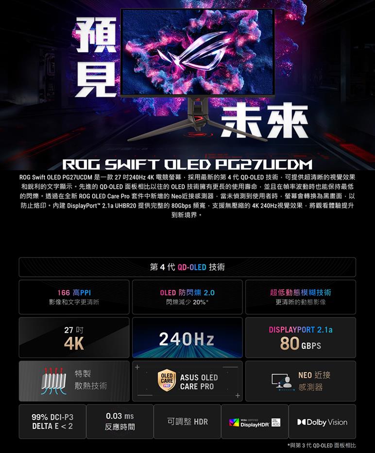 - 第四代 QD-OLED 技術可提供極度清晰銳利的影像和的文字,相比前一代 OLED 擁有更長的使用壽命