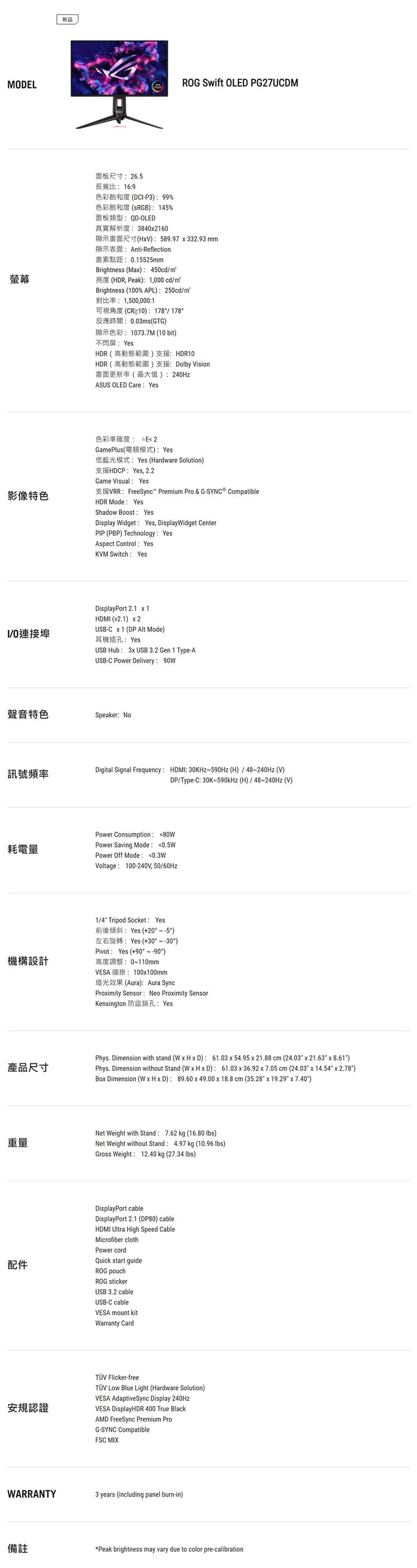 - 26.5 吋 4K (3840 x 2160) QD-OLED 電競螢幕具備 240 Hz 更新率和 0.03 毫秒反應時間