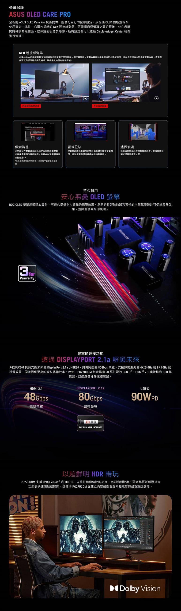 - 全新的 ASUS OLED Care Pro 功能搭配 Neo 近接感測器,可精確偵測與用戶的距離,並在用戶離開座位時切換至黑屏以保護螢幕降低烙印風險
