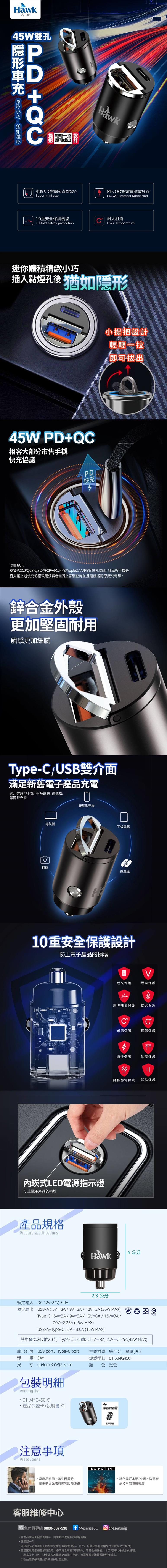 額定輸入:DC 12V/24V, 3.0A 額定輸出: USB-A:5V=3A/9V?3A/12V?3A(36WMAX) Type-C:5V?3A/9V?3A/12V?3A/15V?3A/20V?2.25A (45WMAX) USB-A+Type-C:5V?3.0A(15WMAX) 其中僅為24V輸入時,Type-C方可輸出15V=3A,20V=2.25A 輸出介面: USB port、Type-C port 淨重:34g 尺寸: Ø23*H 40mm 材質:鋅合金、塑膠(PC) |