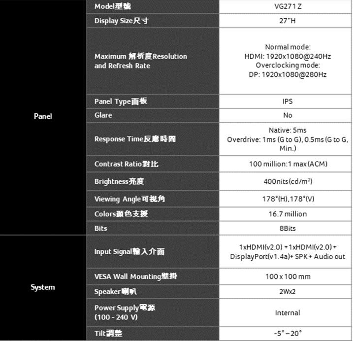● 更新頻率:280Hz