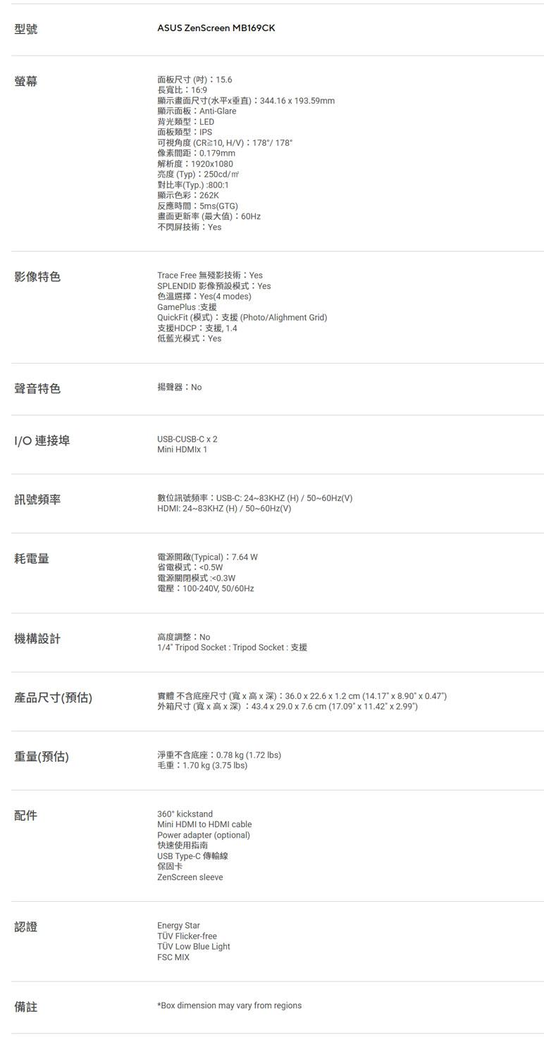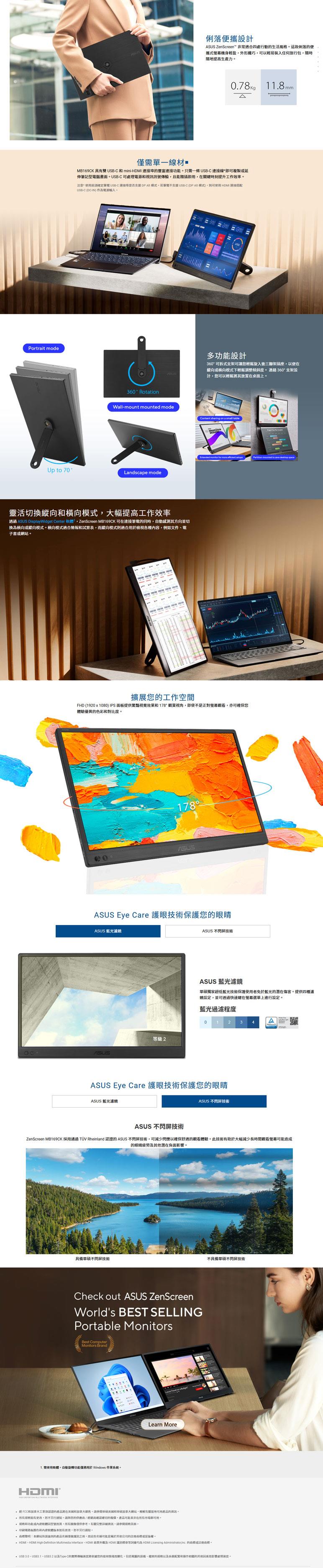 ASUS華碩 16型 ZenScreen MB169CK 可攜式 USB 顯示器 {{specImage.SkuName}}