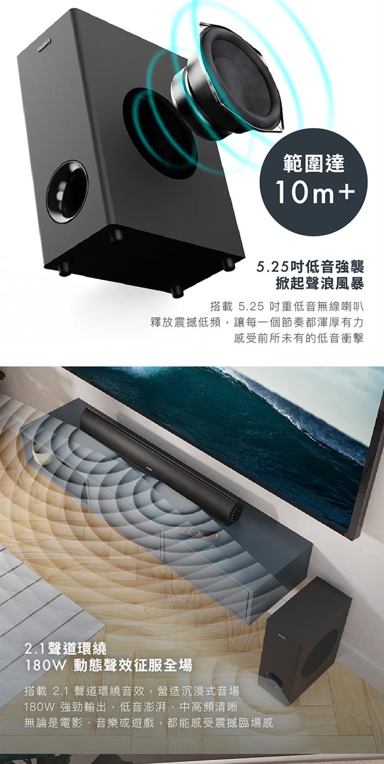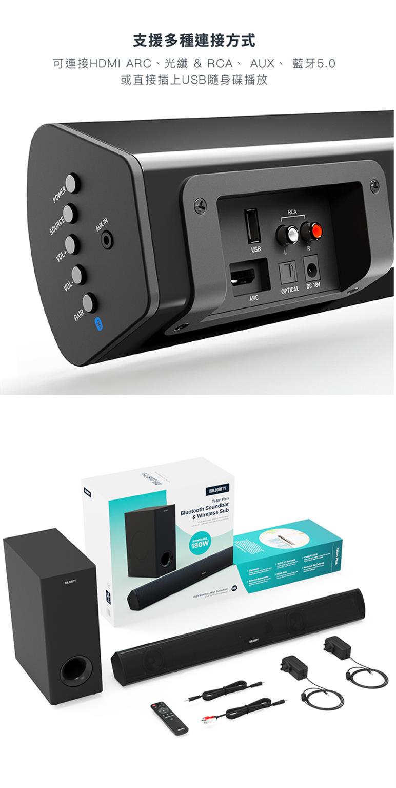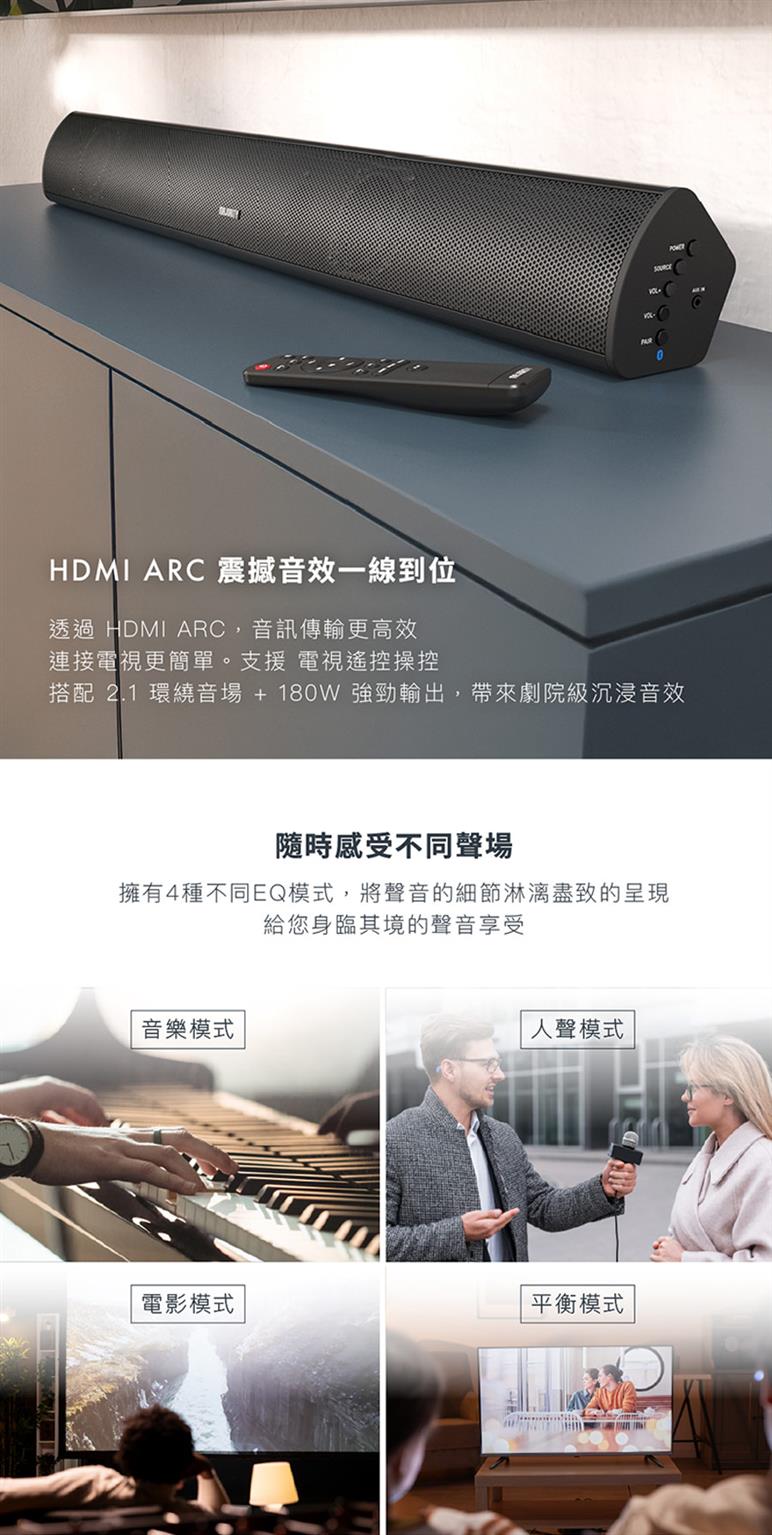 180W強勁輸出,通過 HDMI ARC, USB, AUX, RCA,