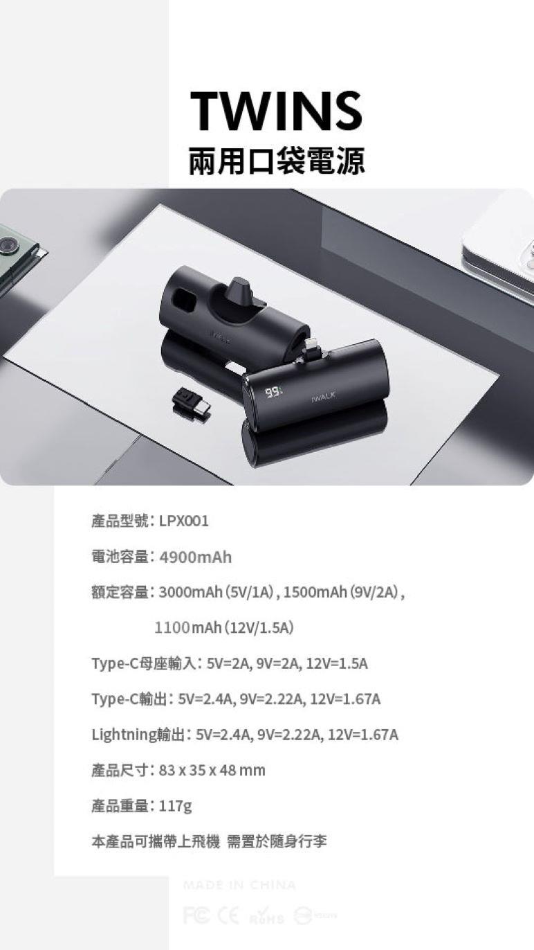 內容物&配件 : 行動電源x1、Type-C充電頭x1、Lightning充電頭x1、專用矽膠保護套x1、Type-C to Type-C充電線x1