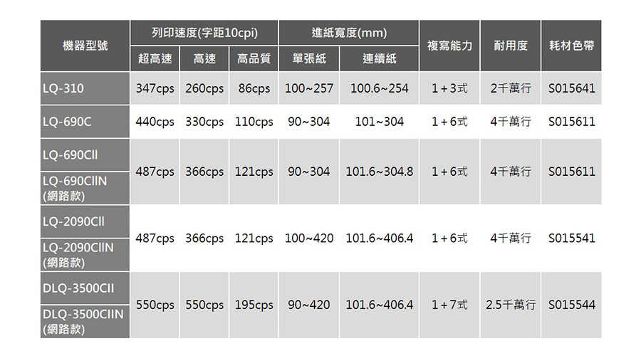 超高速列印模式(10cpi)可達347cps。耐用度高達4億擊次。
