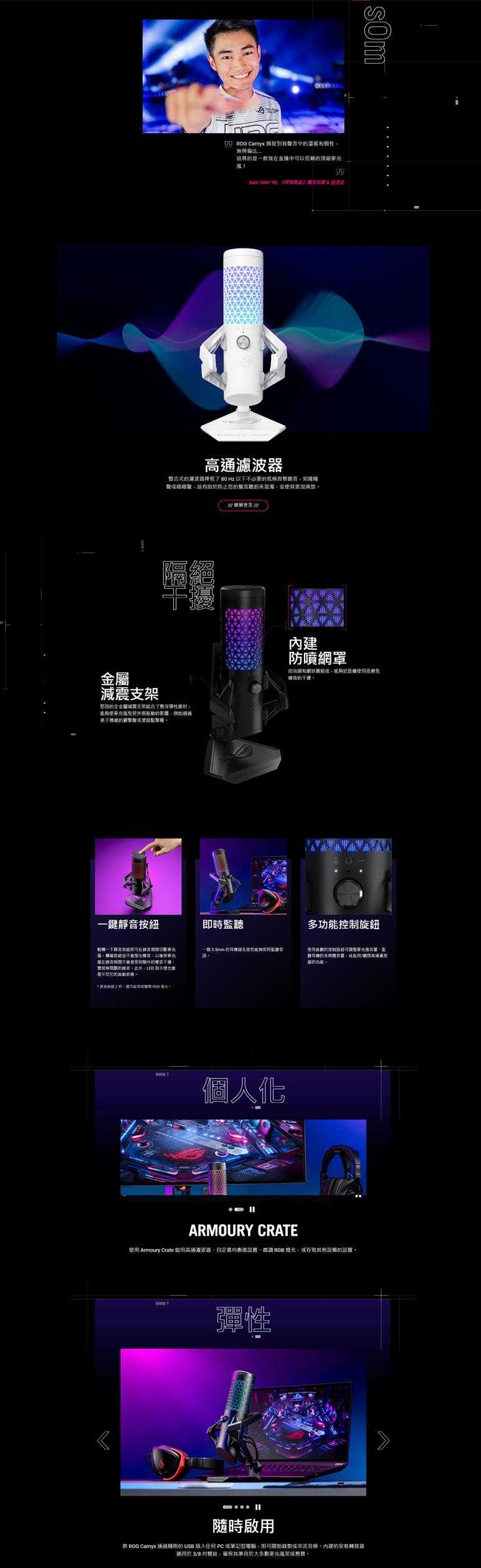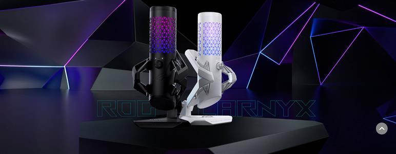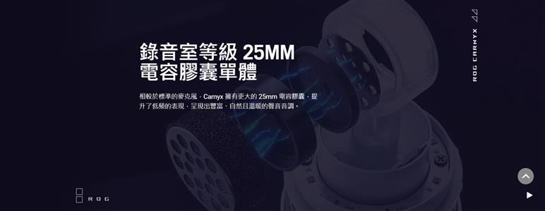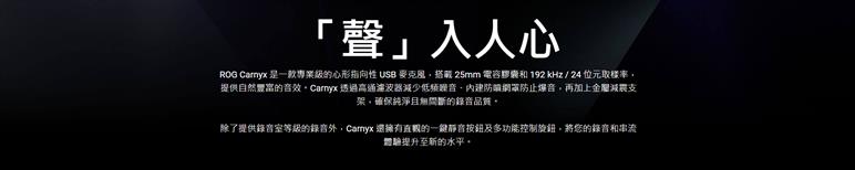 ROG Carnyx 擁有 25 mm 錄音室等級電容式膠囊單體和心形指向性收音、192 kHz / 24 位元取樣率、高通濾波器、內建防噴網罩、優質金屬減震架,以及 ASUS Aura Sync RGB 燈光。