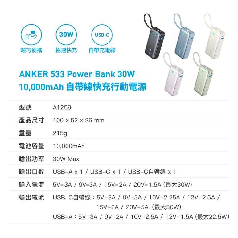 ANKER 533 A1259 Nano 10000mAh 30W 行動電源 冰晶藍原價1490(省200) {{specImage.SkuName}}