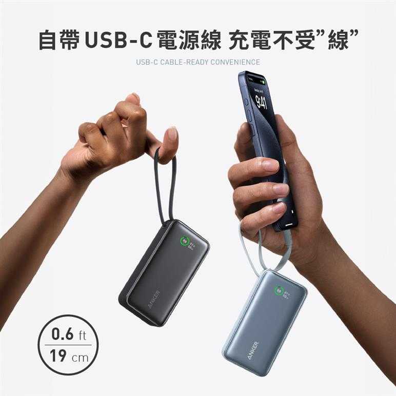 憑藉自帶的USB-C線,享受輕鬆的便攜性和不間斷電源,並配有內置手柄、方便攜帶