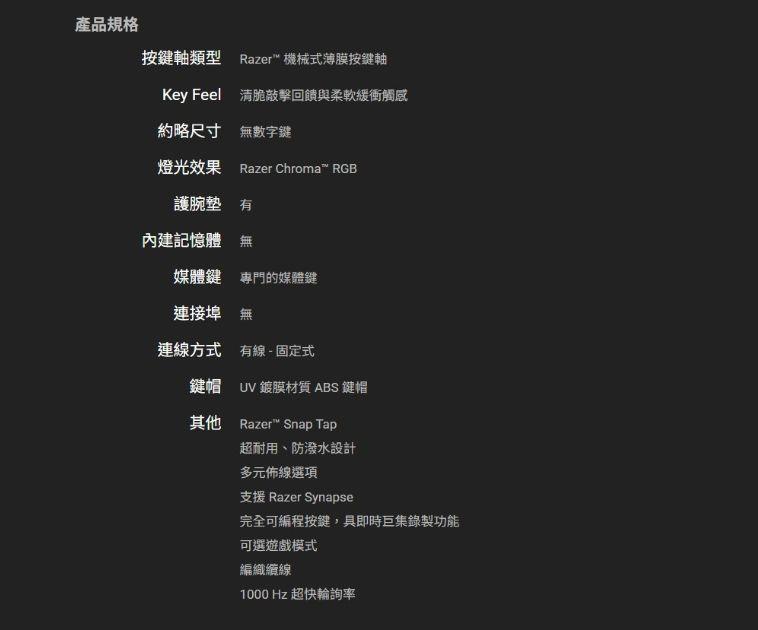 ●採用超纖薄外型設計和獨特 Razer 機械式薄膜按鍵軸