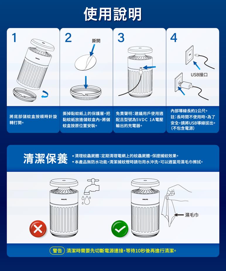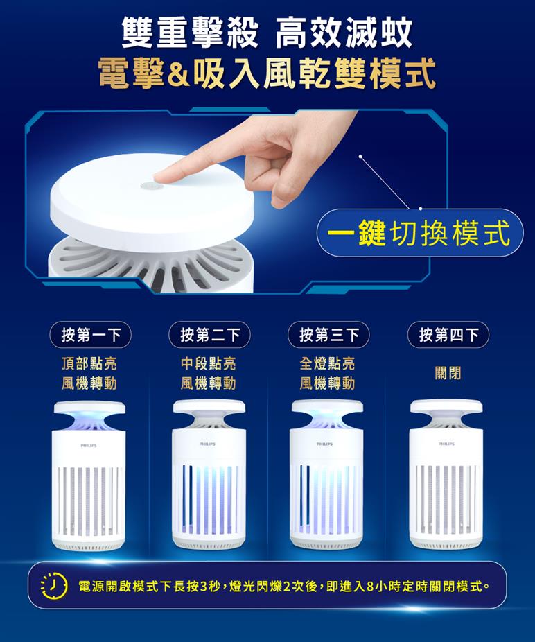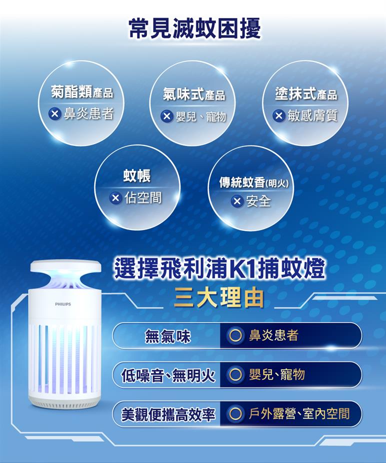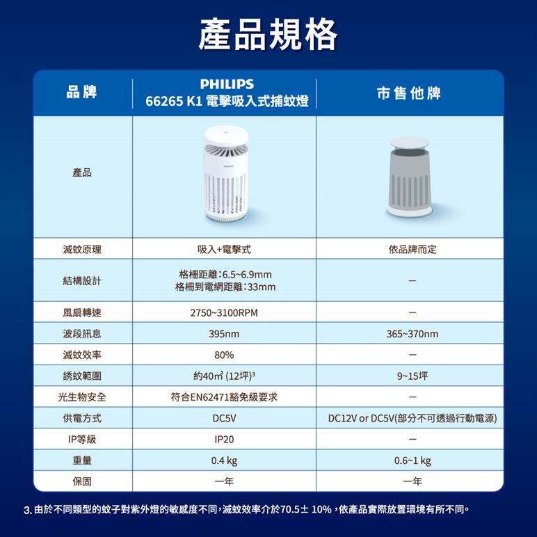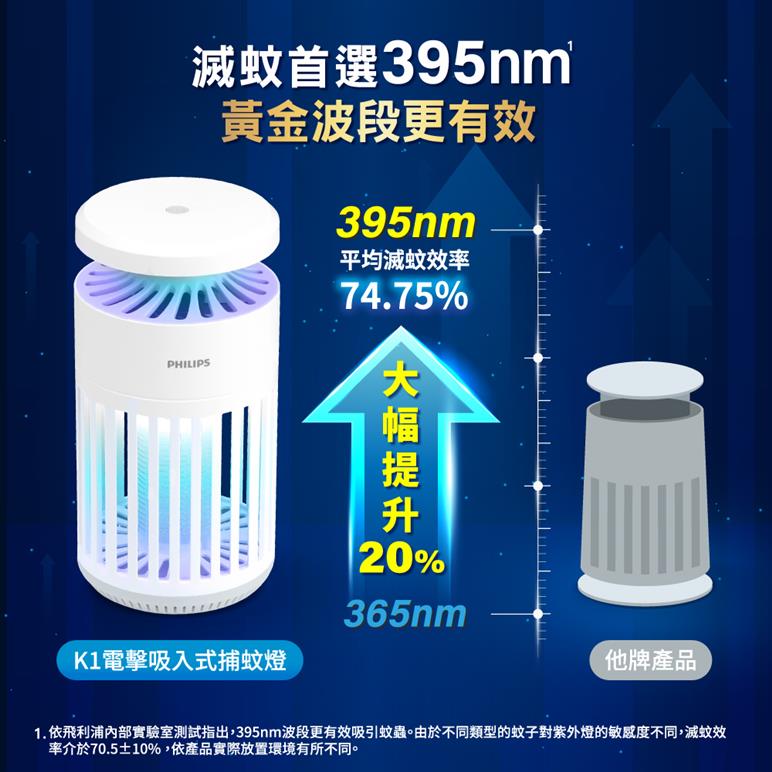 *由於不同類型的蚊子對子外燈的敏感度不同,依飛利浦內部實驗室測試指出,滅蚊效率介於70.5±10%,依產品實際放置環境有所不同。