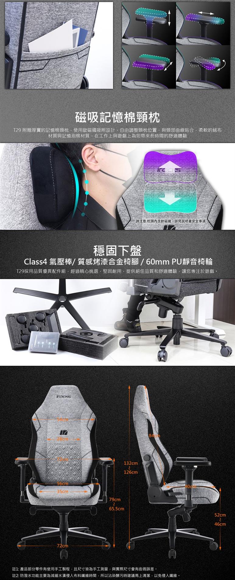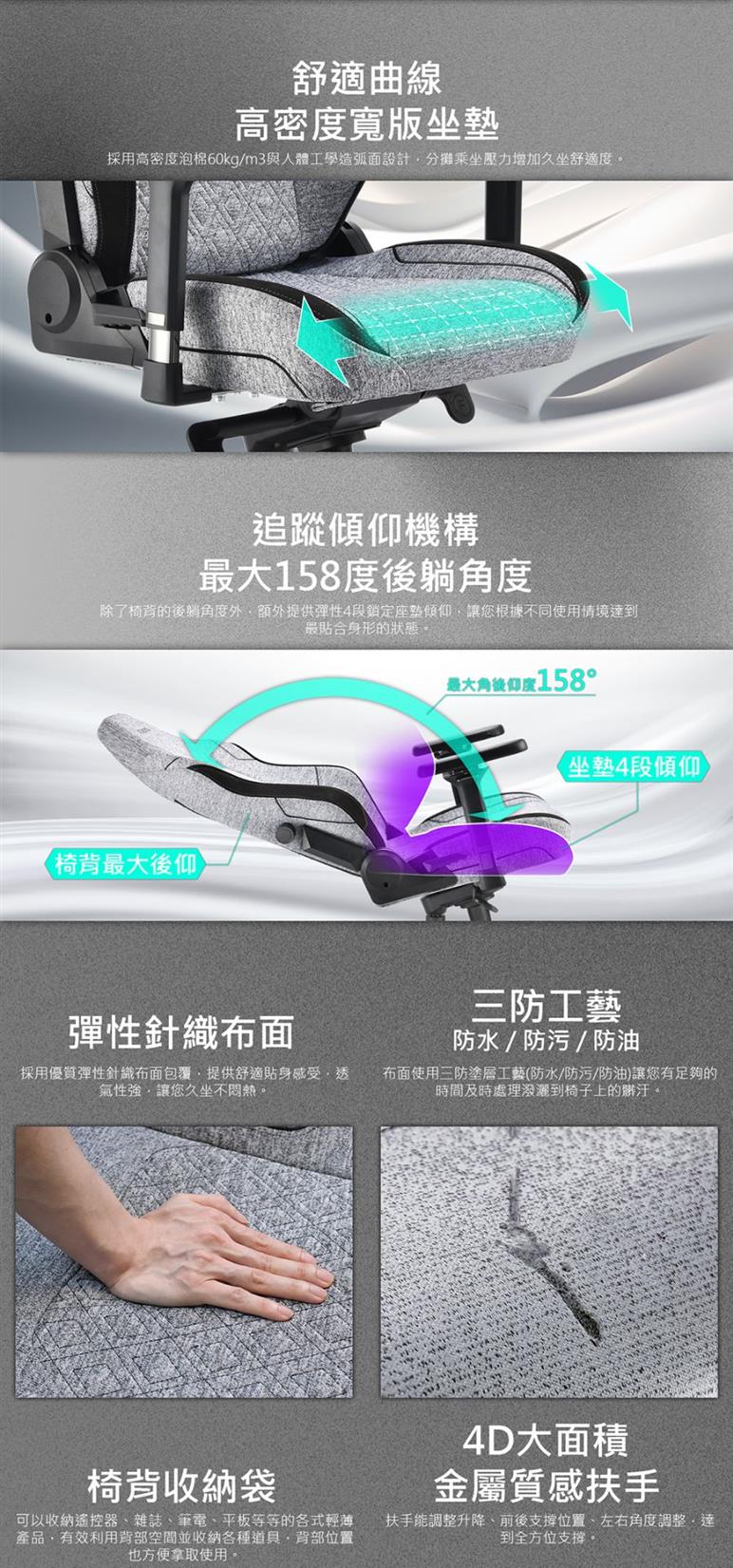 ●採用三防工藝彈性針織布面,延緩水漬、髒污滲透布料時間,易清潔