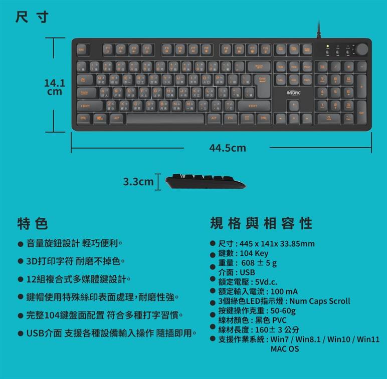 ●完整104鍵盤面配置 符合多種打字習慣