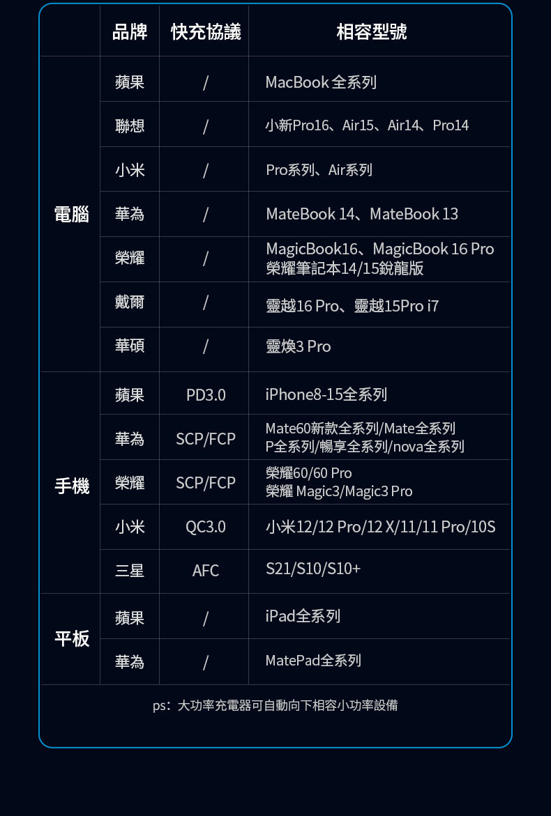 .多設備兼容:支援多項快充協議