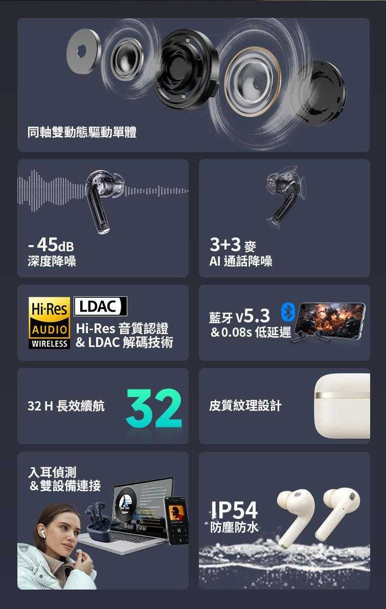 ● 6 MIC 通話降噪 |-45dB ANC主動降噪