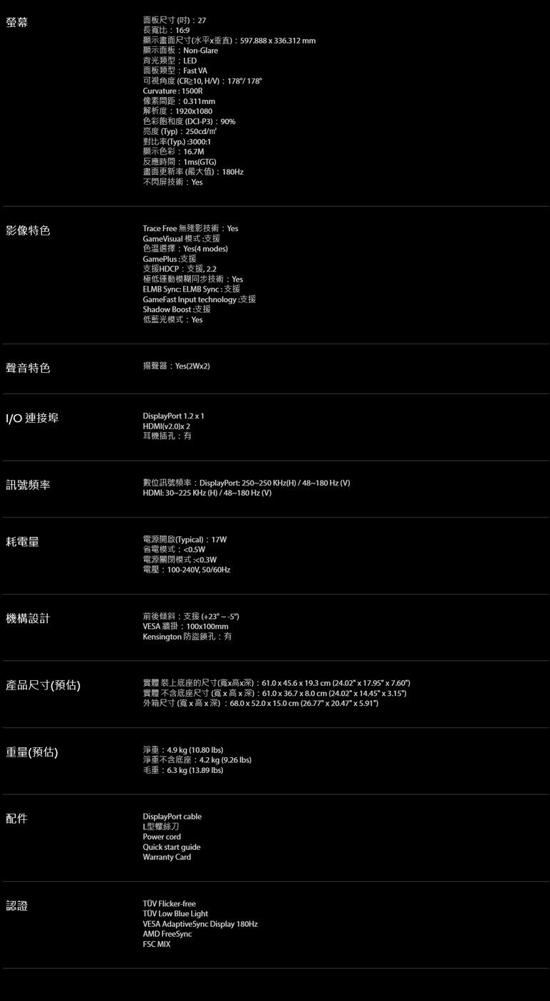 ● 面板尺寸:27吋 1500R Fast VA