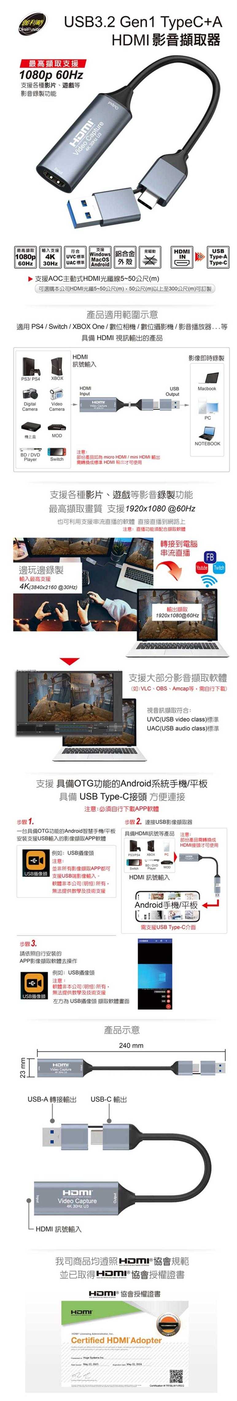 | 輸出介面 | USB Type-C+A 影音擷取 |