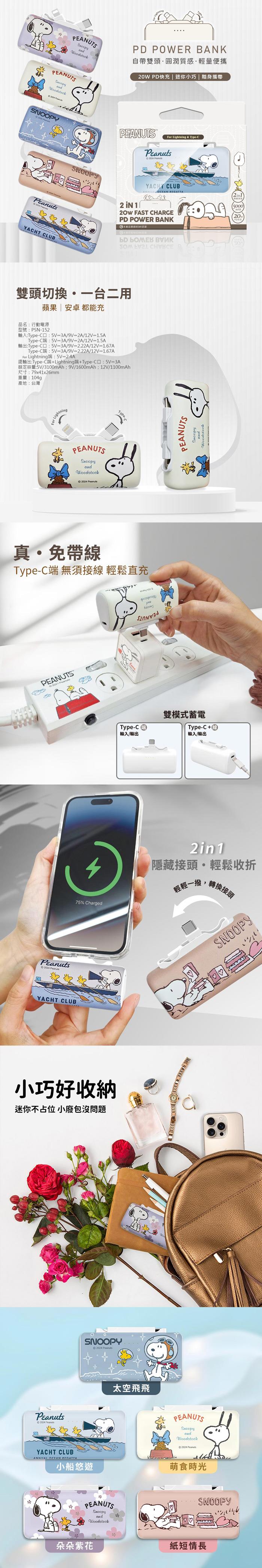 【正版授權】SNOOPY史努比 Type-C + Lightning雙頭口袋充行動電源 5000mAh-太空飛飛 {{specImage.SkuName}}