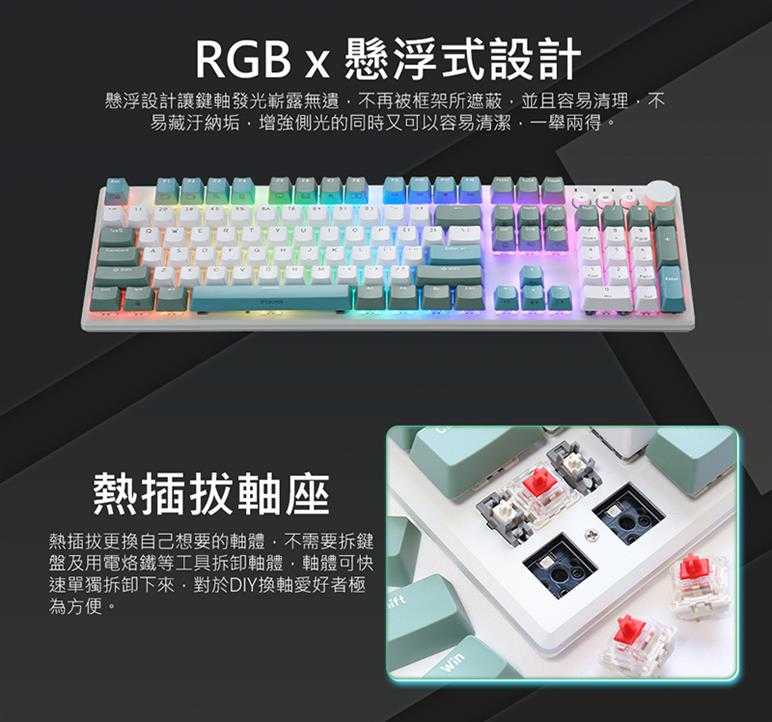 ●全鍵區採用Gateron熱插拔軸座,可自行替換鍵軸