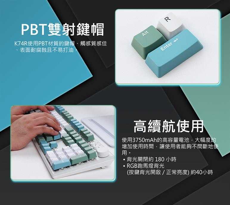 ●RGB背光設計,PBT二色成形鍵帽,乾爽止滑耐打油