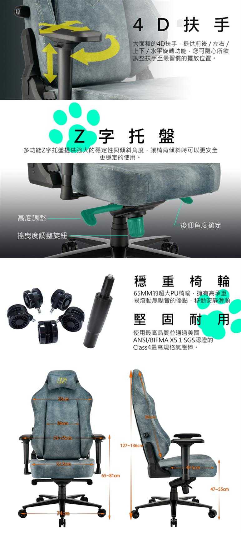 使用最高品質並通過美國ANSI/BIFMA X5.1 SGS認證的Class4最高規格氣壓棒。