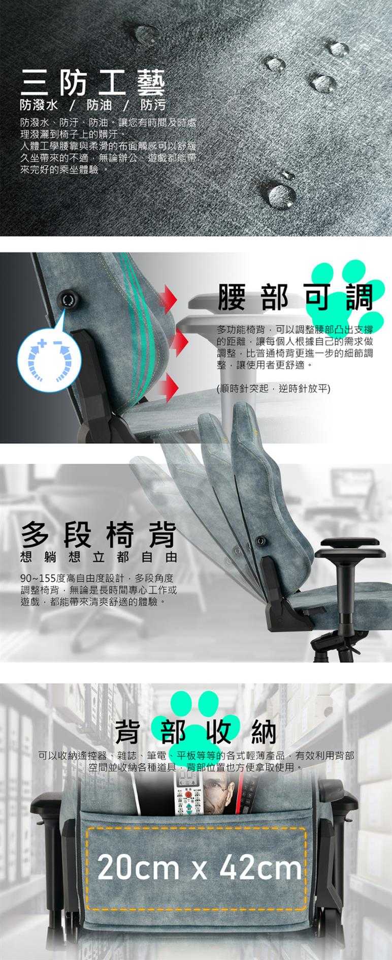 防潑水、防汙、防油。讓您有時間及時處理潑灑到椅子上的髒汙。 人體工學腰靠與柔滑的布面觸感可以舒緩久坐帶來的不適,無論辦公、遊戲都能帶來完好的乘坐體驗 。