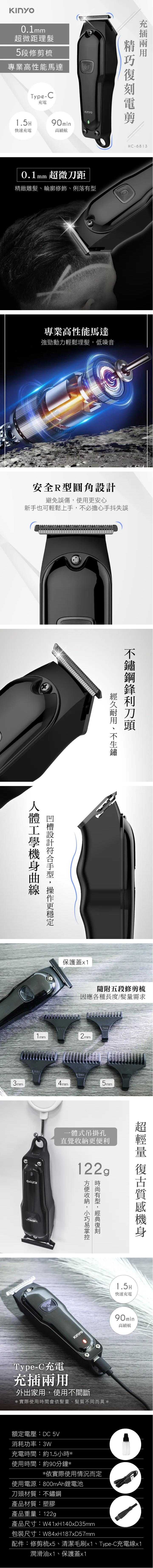 - 配件:修剪梳x5、清潔毛刷x1、Type-C充電線x1、潤滑油x1、保護蓋x1