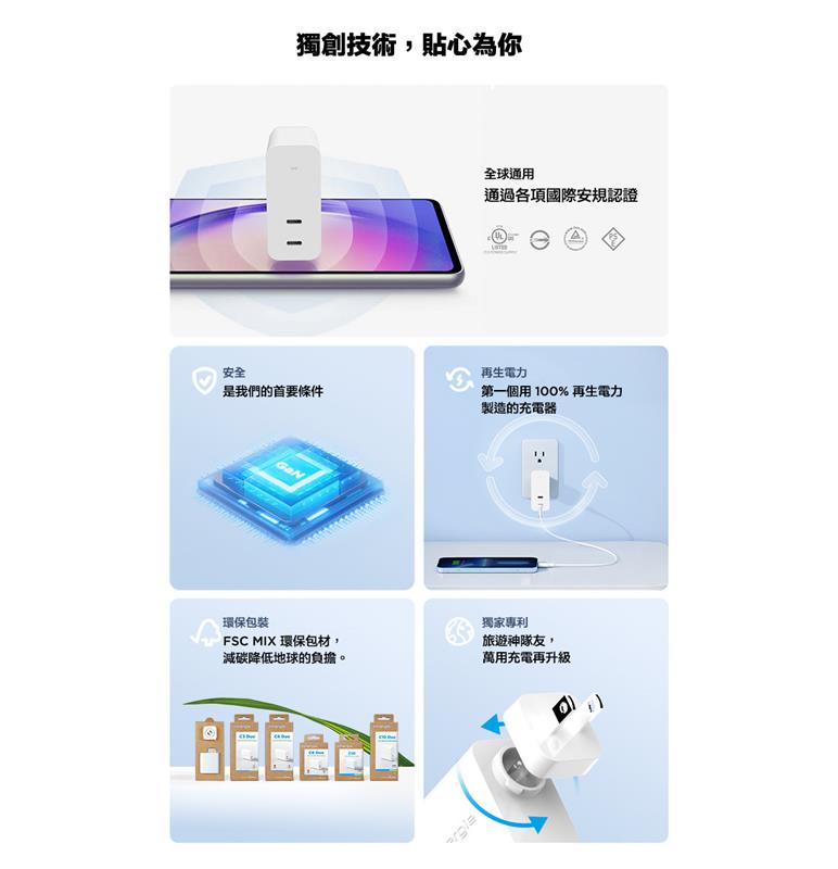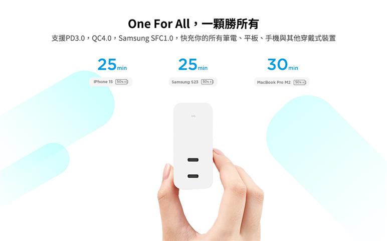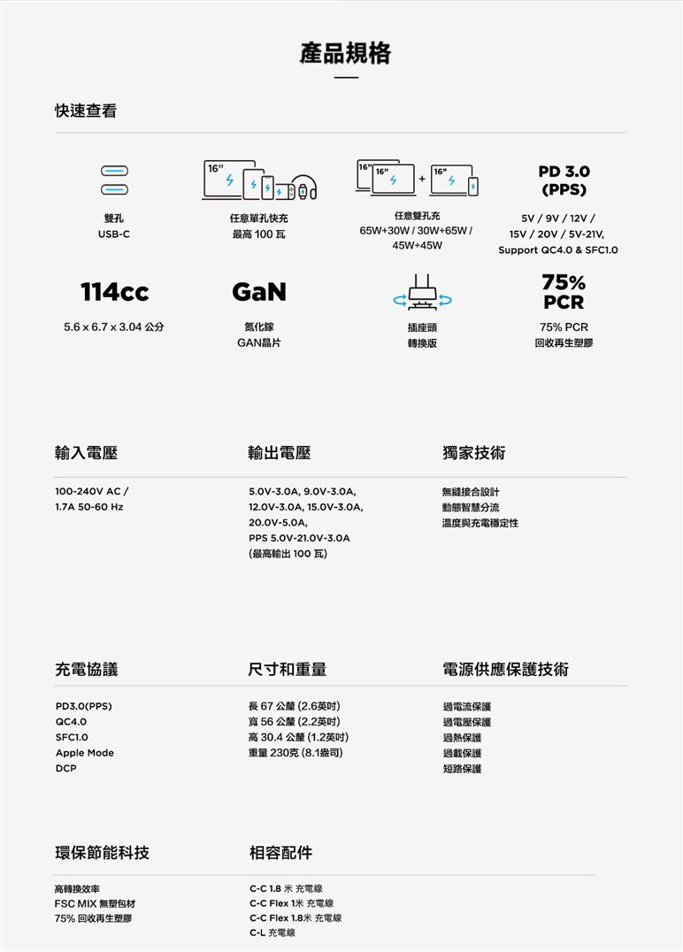 - 100瓦雙孔快充|搭載GaN氮化鎵,支援PD3.0、QC4.0、Samsung SFC1.0 25W快充協議