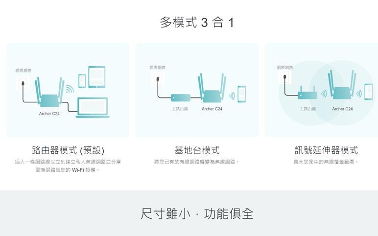 ● 多種模式 3 合 1 - 支援路由器、基地台、訊號延伸器模式