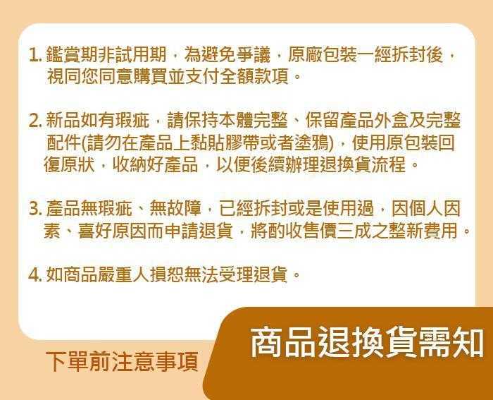 ■如需辦理退換貨,包裝與配件須完整(商品配件、包裝完整,無刮痕損傷)。