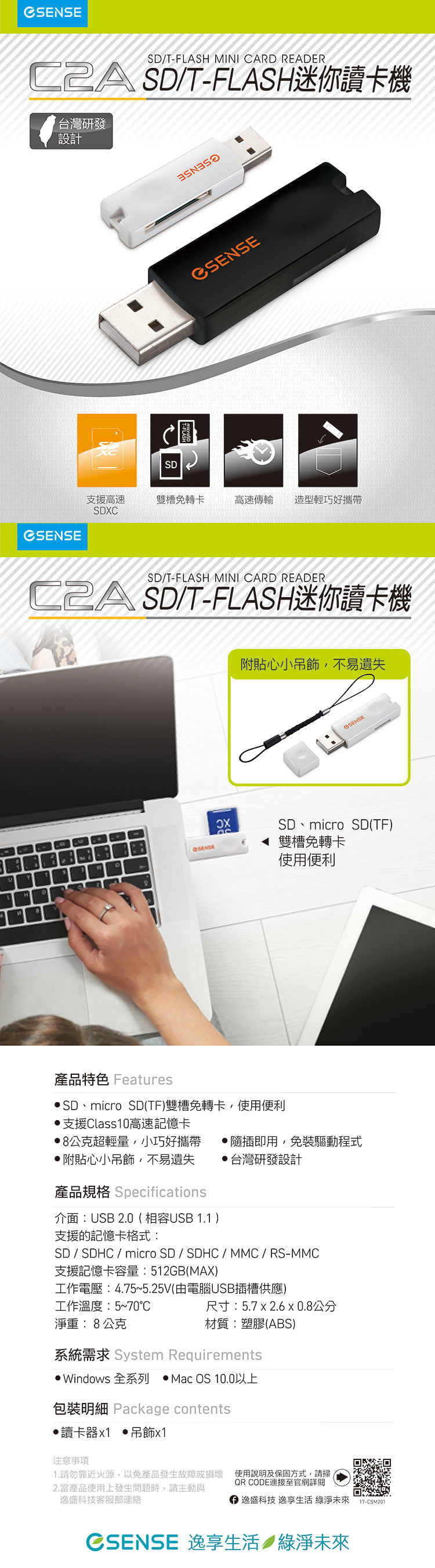 介面:USB 2.0(相容USB 1.1) 支援的記憶卡格式 :SD/SDHC/micro SD / SDHC / MMC / RS-MMC 支援記憶卡容量:512GB(MAX) 工作電壓:4.75~5.25V(由電腦USB插槽供應) 工作溫度:5~70℃ 尺寸:57x26x8mm 淨重:8公克 材質:塑膠(ABS) 認證:D3A141+RoHS |