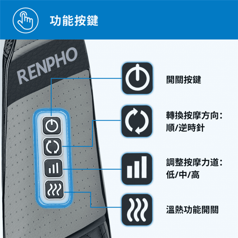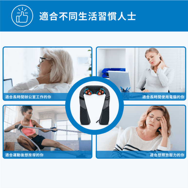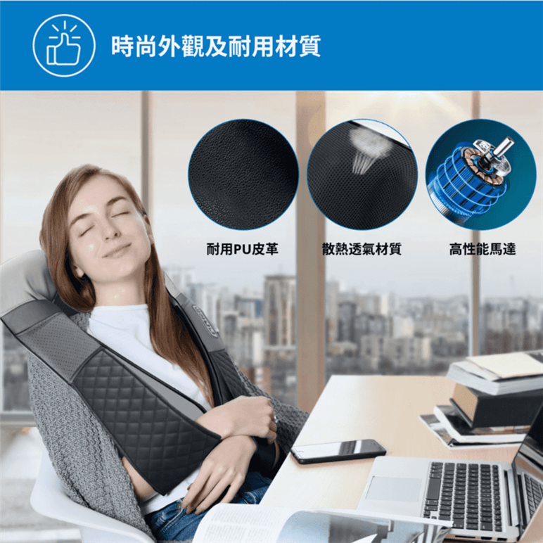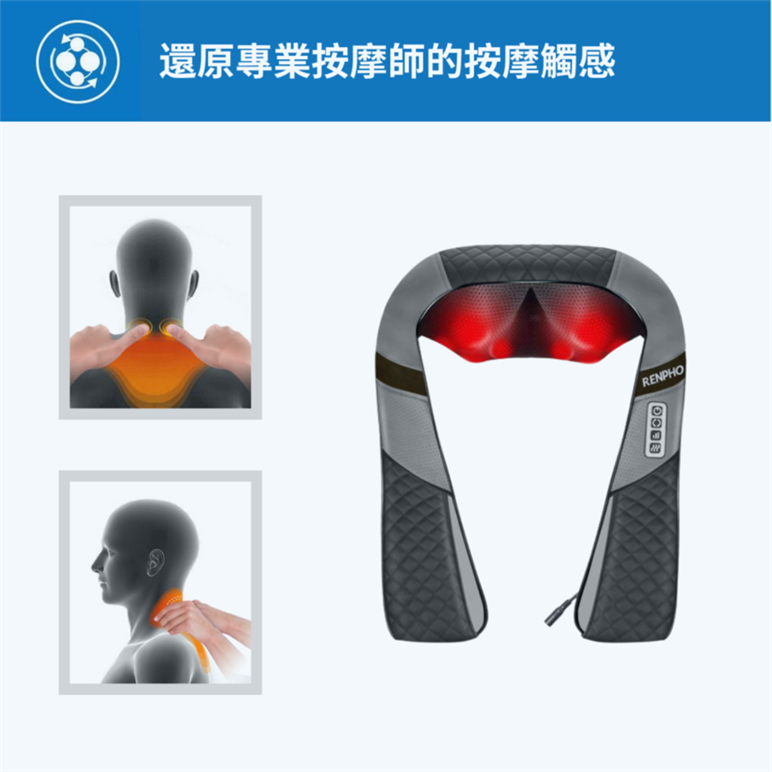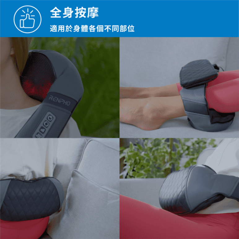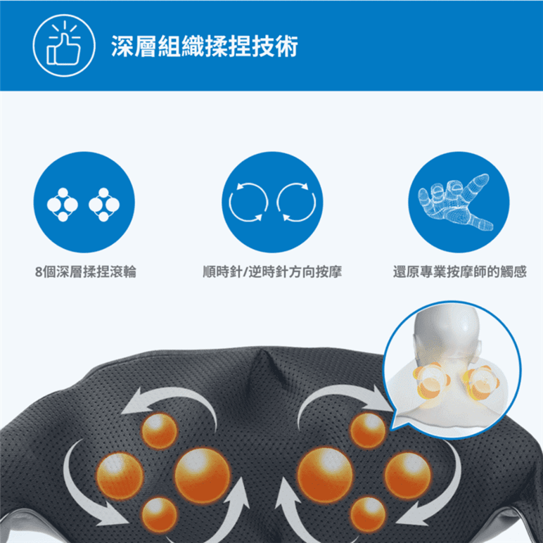 ● 8 個深層組織揉捏節點搭配3種強度讓您全身的痠痛得到舒緩。