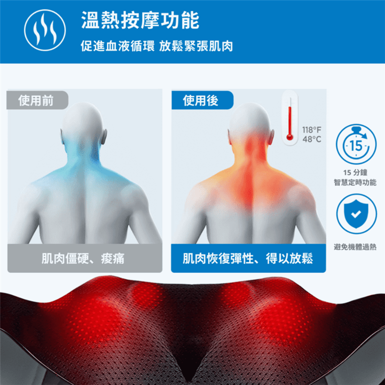 ● 加熱功能可溫暖身體,改善血液循環,同時放鬆緊張的肌肉。