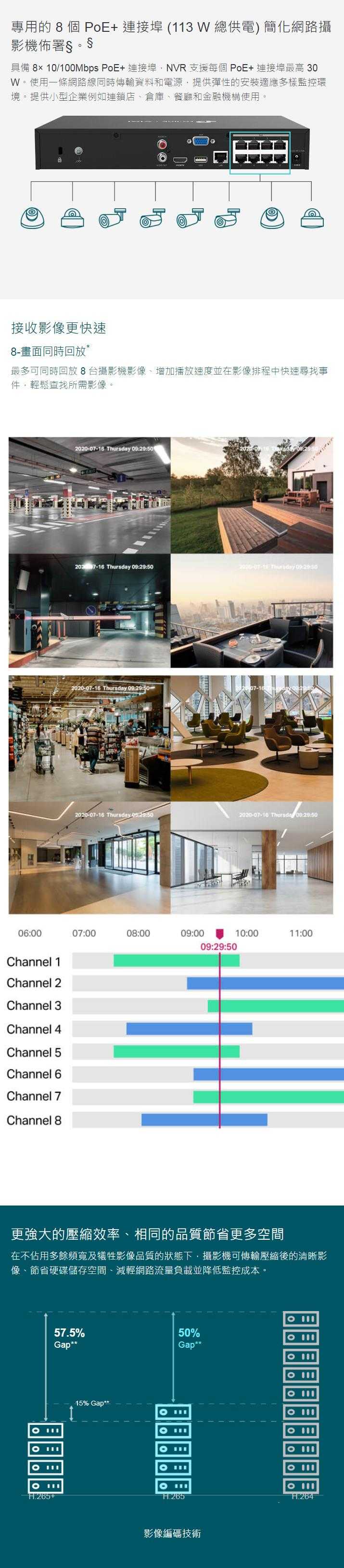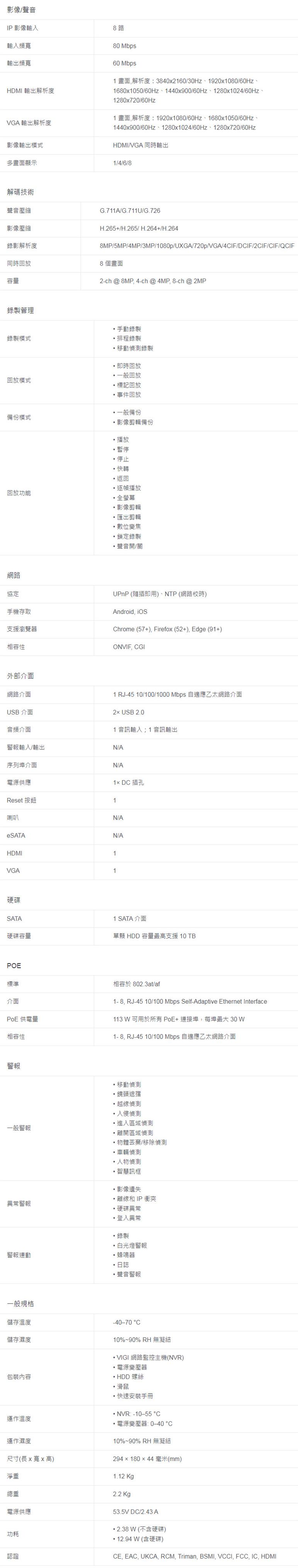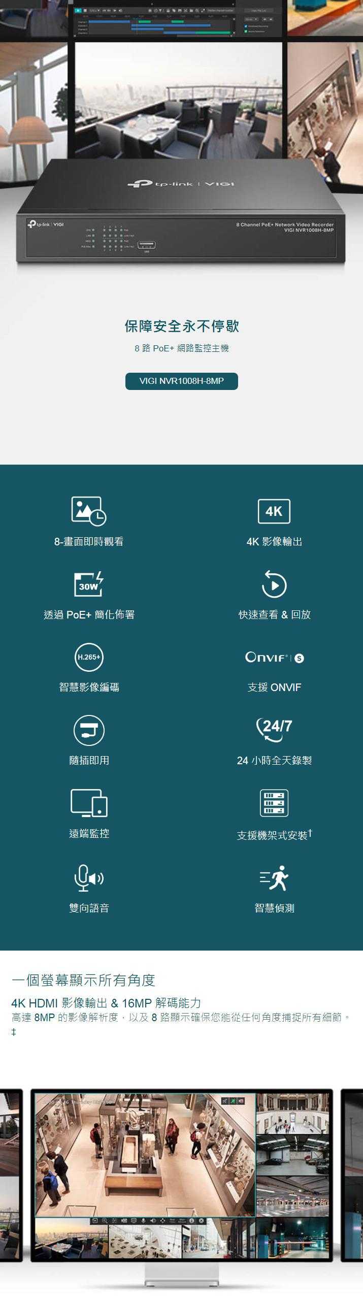 - 4K HDMI 影像輸出 & 16MP 解碼能力: 提供高達 8MP 的更清晰影像解析度以及 8 路畫面顯示,確保您可以從任何角度捕捉所有細節‡。