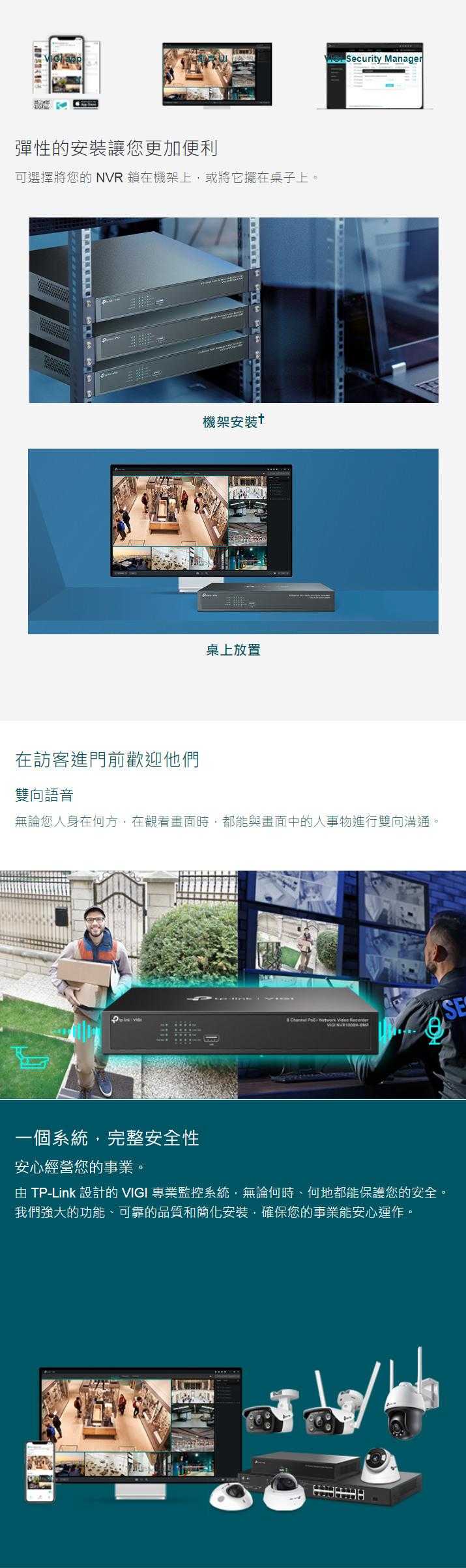 - 遠端監控: 獨家 VIGI app、網頁介面和 VIGI Security Manager 讓便利的遠端監控不是夢,無論何時何地都能觀看即時影像和回放。
