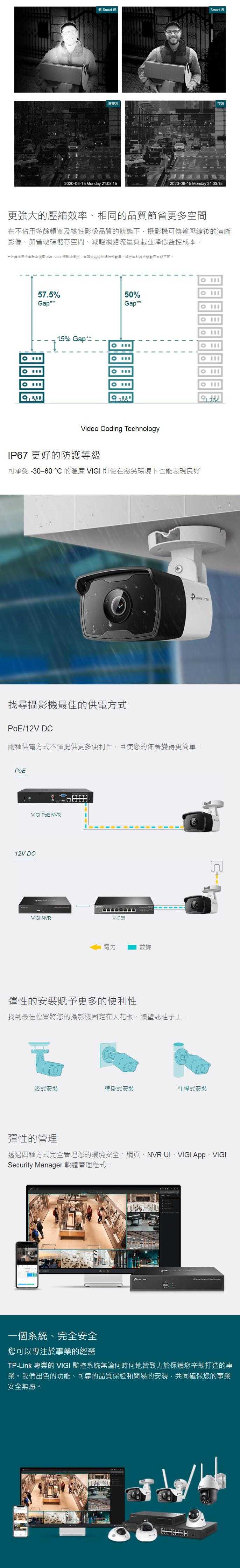 - 智慧影像增強技術:VIGI 的專業影像處理技術大幅提升您對監控品質的需求,包括智慧紅外線(Smart IR)、寬動態範圍(WDR)、3D雜訊抑制(3D DNR)及夜視功能。