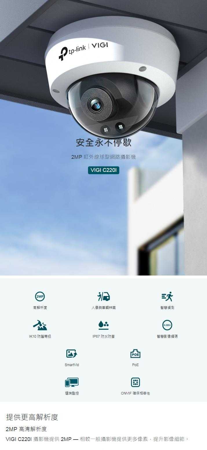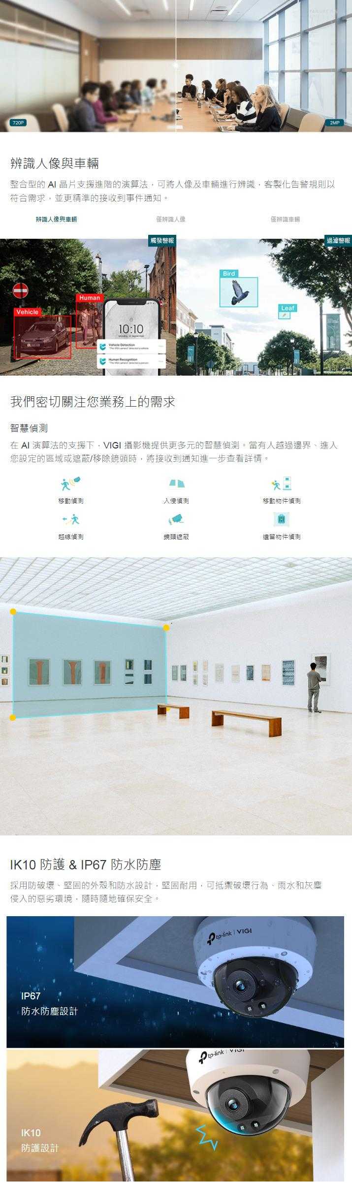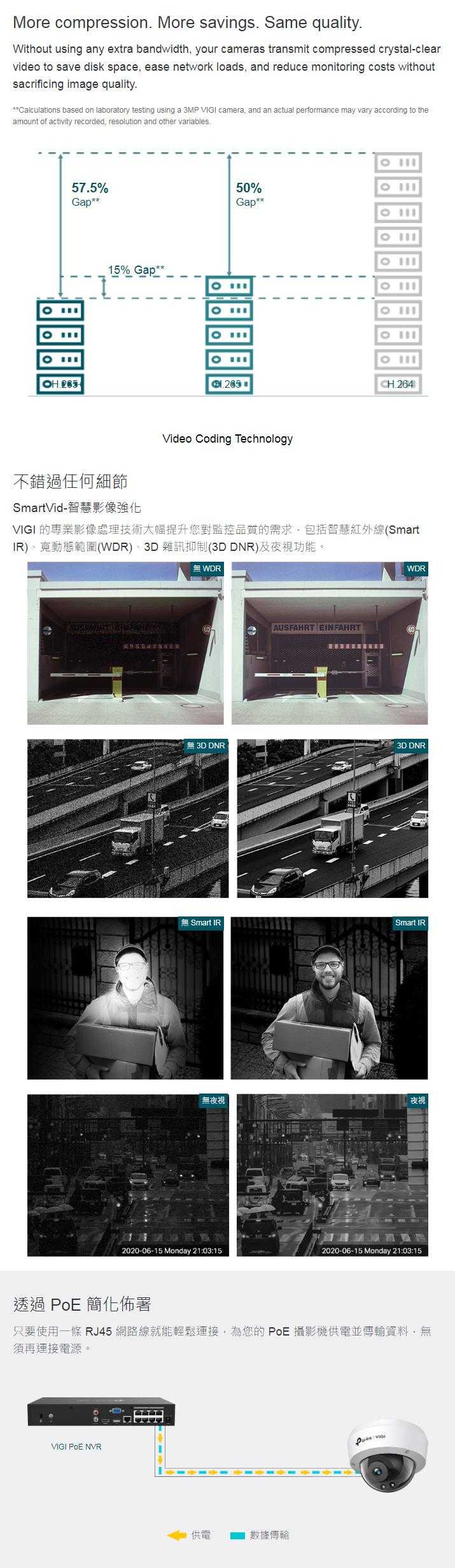 - 智慧影像強化:VIGI 的專業影像處理技術大幅提升您對監控品質的需求,包括智慧紅外線(Smart IR)、寬動態範圍(WDR)、3D雜訊抑制(3D DNR)及夜視功能。