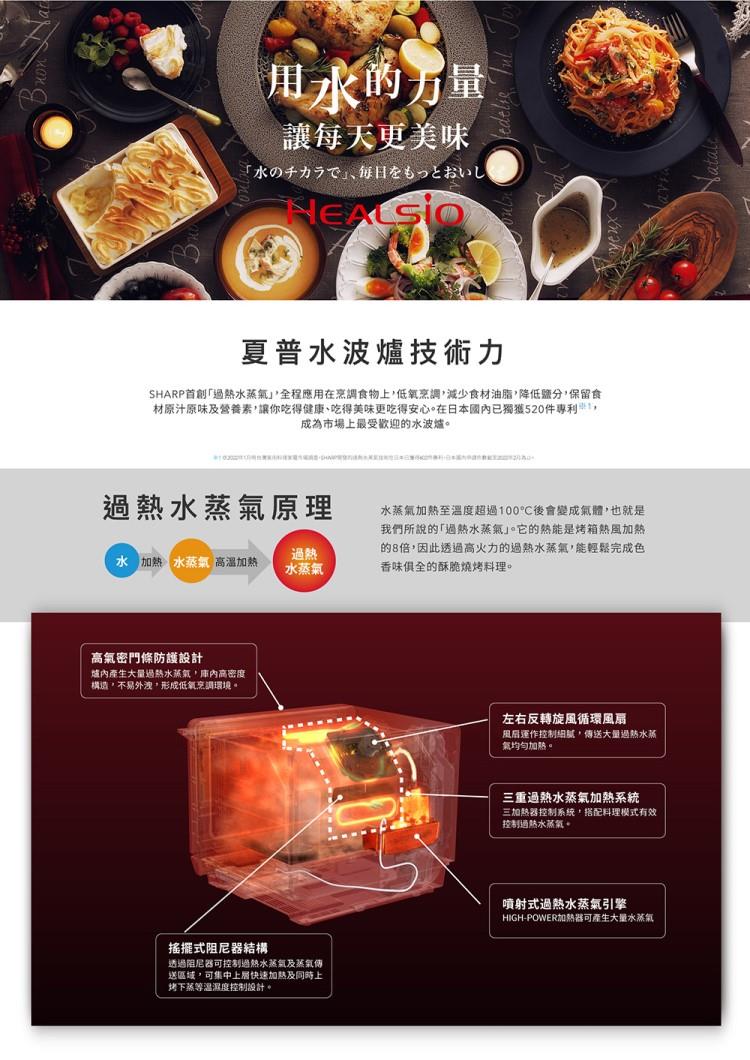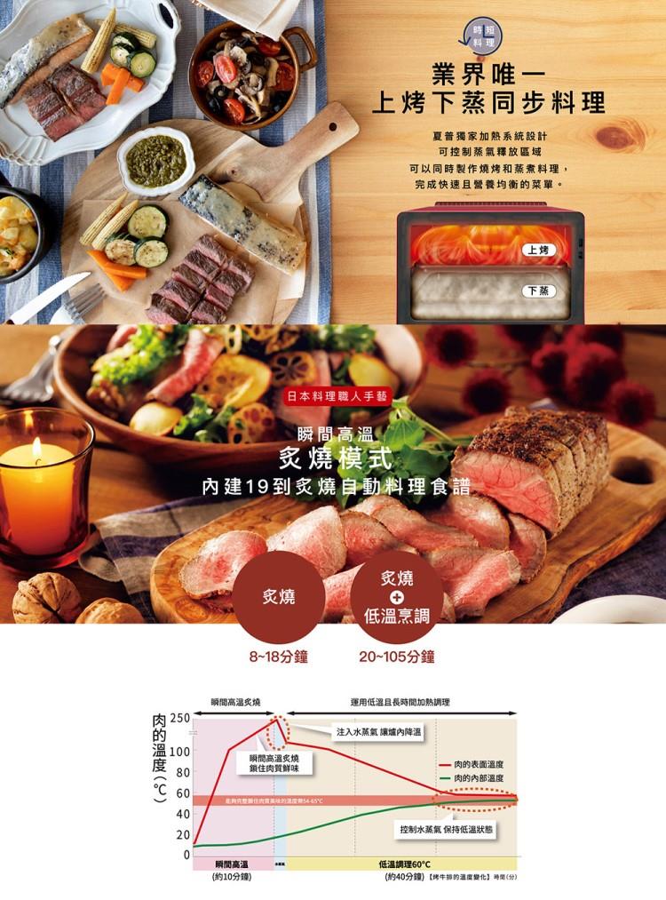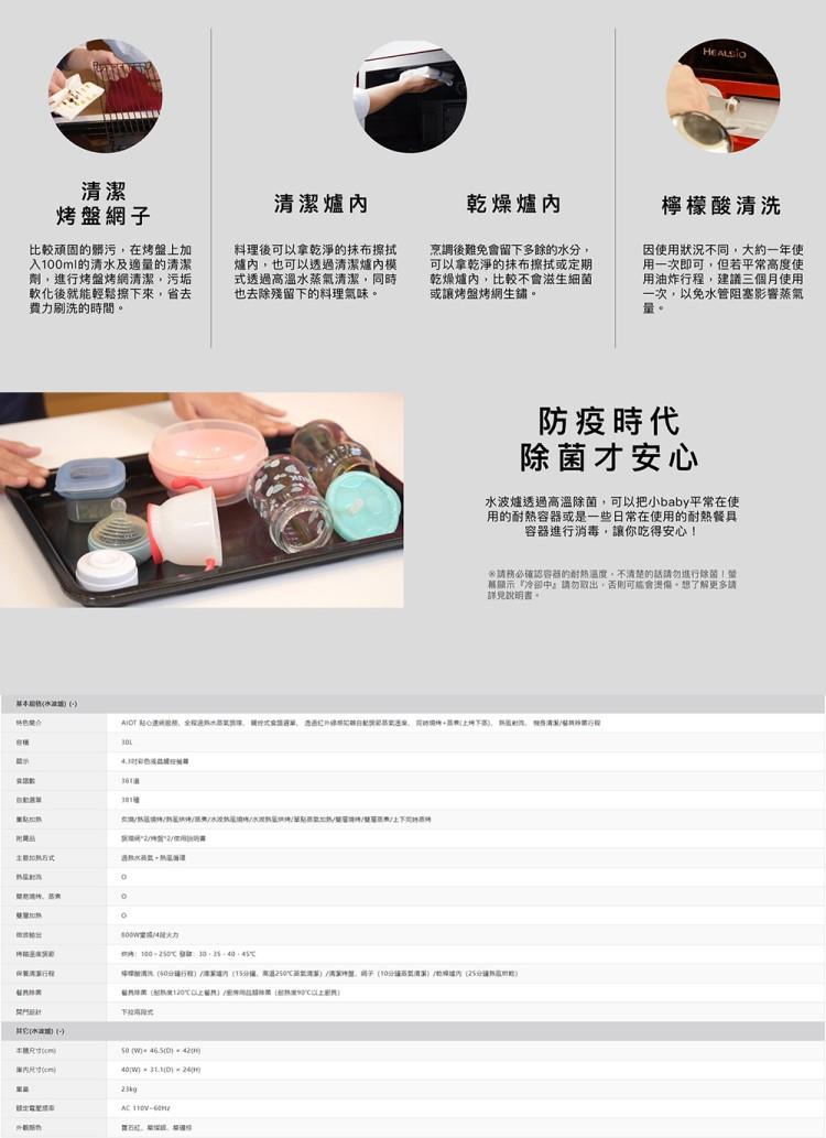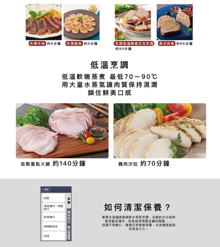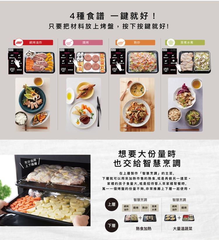 | 特色簡介 | AIOT 貼心連網服務、全程過熱水蒸氣調理、 觸控式食譜選單、 透過紅外線感知器自動調節蒸氣溫度、 同時燒烤+蒸煮(上烤下蒸)、 熱風對流、 機身清潔/餐具除菌行程 |