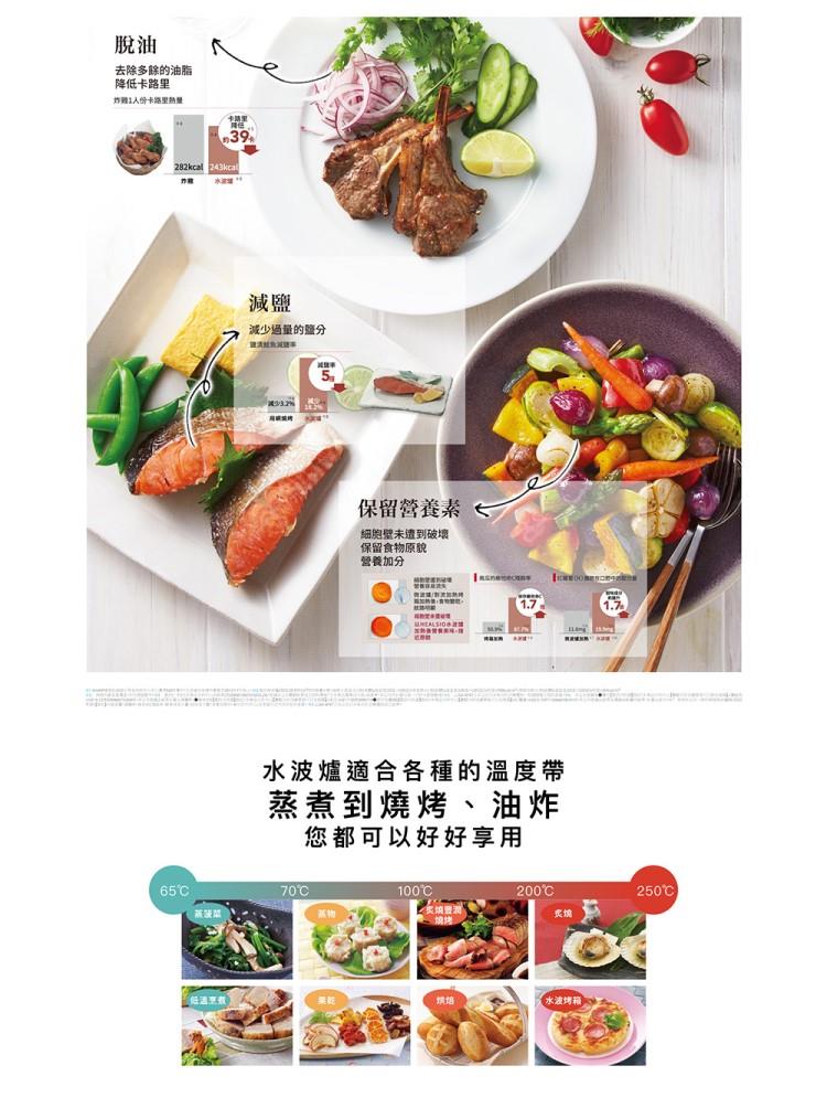 | 重點加熱 | 炙燒/熱風燒烤/熱風烘烤/蒸煮/水波熱風燒烤/水波熱風烘烤/單點蒸氣加熱/雙層燒烤/雙層蒸煮/上下同時蒸烤 |